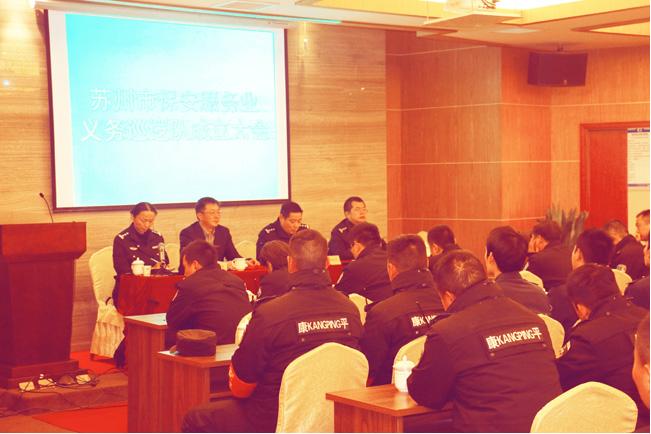 2015年12月3日,蘇州市保安服務(wù)業(yè)義務(wù)巡邏隊(duì)成立大會(huì)在江蘇康平保安服務(wù)有限公司召開。會(huì)議由蘇州市公安局治安支隊(duì)監(jiān)管大隊(duì)教導(dǎo)員陸萍主持,蘇州市公安局治安支隊(duì)副支隊(duì)長郭偉平、蘇州市公安局治安支隊(duì)監(jiān)管大隊(duì)大隊(duì)長朱永忠及蘇州市保安服務(wù)行業(yè)協(xié)會(huì)會(huì)長畢坤明出席了會(huì)議。蘇州市公安局各分局治安大隊(duì)領(lǐng)導(dǎo)及蘇州市五家保安服務(wù)有限公司巡邏員代表50余人參加了會(huì)議。